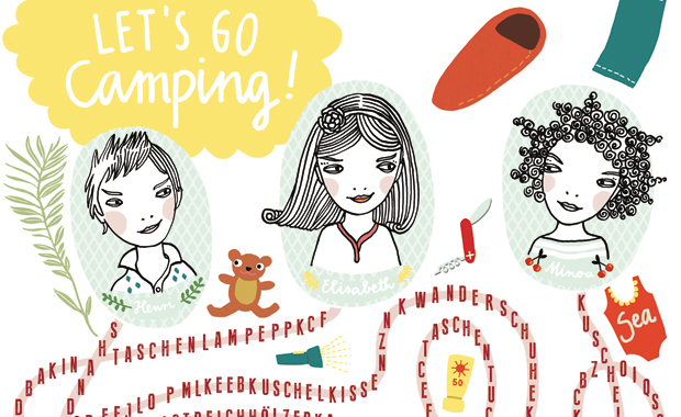 HIMBEERCHEN Kinderrätsel: Auf den Wegen sind 17 Dinge versteckt, die man beim Zelten gut gebrauchen kann. Findest du alle? Und welches Kind weiß den Weg zum Zelt?